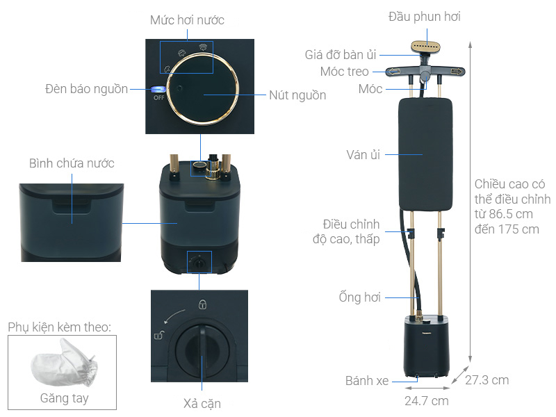 – Bạn có thể dễ dàng điều chỉnh chiều cao bàn ủi linh hoạt từ 86.5 – 175 cm giúp bạn sử dụng thiết bị với tư thế thoải mái, giảm tình trạng đau lưng, mỏi cổ.