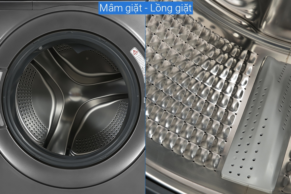 – Lồng giặt dạng Pillow được hoàn thiện từ chất liệu thép không gỉ, có thiết kế đặc biệt với bề mặt hình gối và lỗ thoát nước rất nhỏ chỉ 2.5 mm giúp cho việc giặt quần áo dễ dàng, bảo vệ quần áo tránh hiện tượng xơ vải mắc vào lỗ thoát nước.