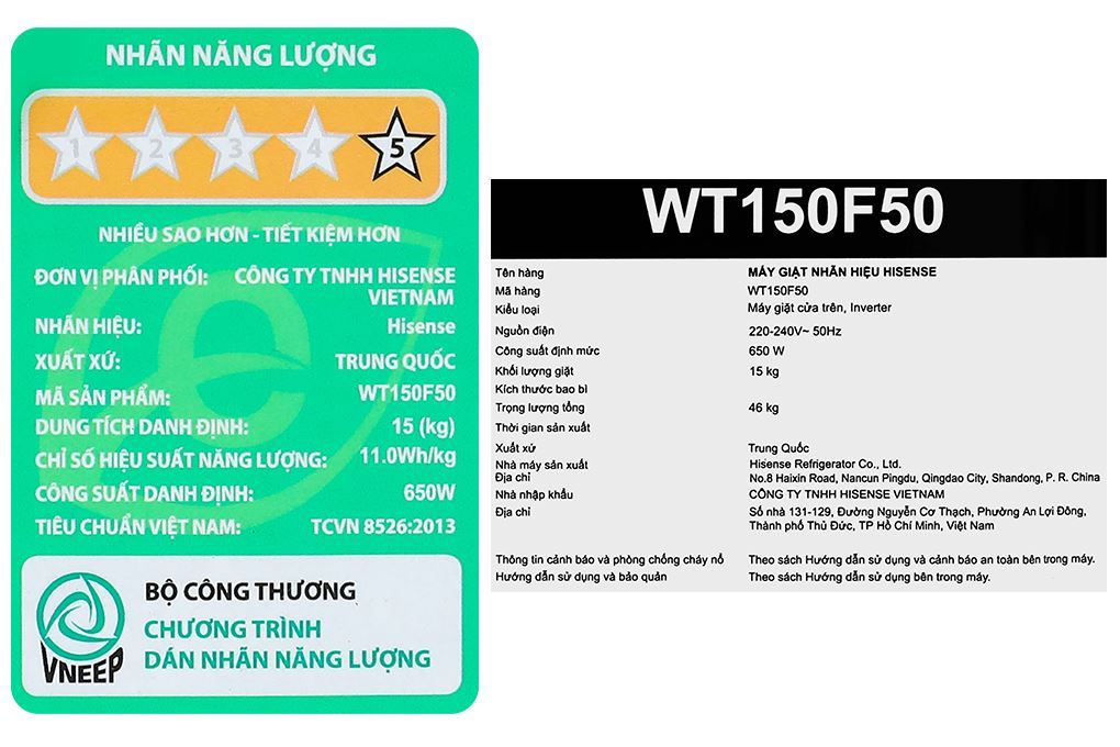 Máy giặt Hisense Inverter 15 kg WT150F50 mang phong cách hiện đại, màu sắc trung tính dễ phối với nhiều không gian như phòng giặt, ban công hay khu vực phơi đồ. Thiết kế cửa trên mở hướng lên giúp thao tác thoải mái, không cần khom lưng khi lấy hoặc cho quần áo vào máy, rất tiện cho gia đình có người lớn tuổi.