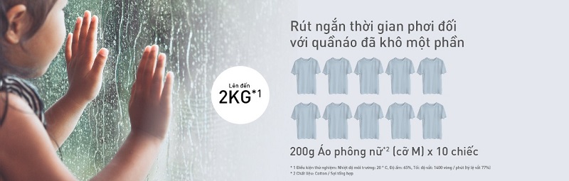 Vô cùng phù hợp những gia đình không có nơi để phơi đồ, không gian chật hẹp như chung cư. Không khí bên ngoài được hút qua các lỗ thông khí và được làm nóng bằng máy sưởi 300w để duy trì nhiệt độ bên trong lồng giặt xấp xỉ 55°C, giúp làm khô quần áo của bạn bất cứ khi nào bạn cần.