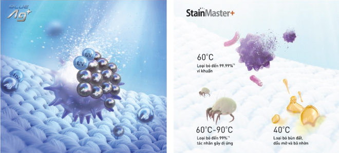 Quần áo luôn được diệt khuẩn tối ưu đến 99.99% ở mức nhiệt độ 55 độ C trong khi sấy với công nghệ giặt nước nóng StainMaster+. Ngoài ra, khi chúng ta giặt bằng nước lạnh cũng có thể diệt khuẩn đên 99,99% nhờ công nghệ Blue Ag+ và cũng có khả năng kháng khuẩn nhờ tia UV