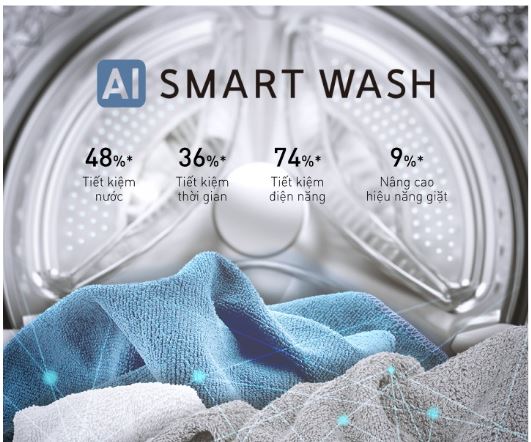 Sử dụng trí tuệ nhân tạo AI SMART WASH giúp tiết kiệm 48% nước, 36% thời gian, 74% điện năng và nâng cao 9% hiệu năng hoạt động nhưng quần áo vẫn được giặt sạch tối ưu