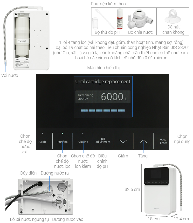 – Máy lọc nước Panasonic trang bị 5 tấm điện cực Titanium phủ Platinum sản xuất tại Nhật. Các tấm điện cực này đóng vai trò điện phân nước, phân tách, tái tạo cấu trúc nước chứa nhiều khoáng chất thành nước ion kiềm giàu Hydrogen tốt cho sức khoẻ.
