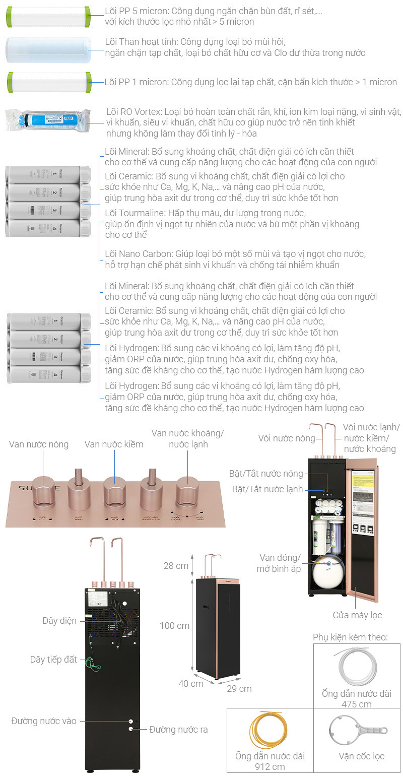 –Lõi Hydrogen(sản xuất Việt Nam): bổ sung các vi khoáng có lợi, làm tăng độ pH, giảm ORP của nước, giúp trung hòa axit dư, chống oxy hóa, tăng sức đề kháng cho cơ thể.