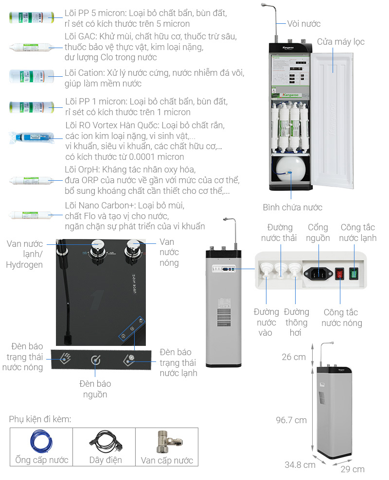 Thời gian bảo hành: Phần điện: 24 tháng – Bình áp: 24 tháng – Lõi RO: Không bảo hành – Hệ thống nóng lạnh: 24 tháng