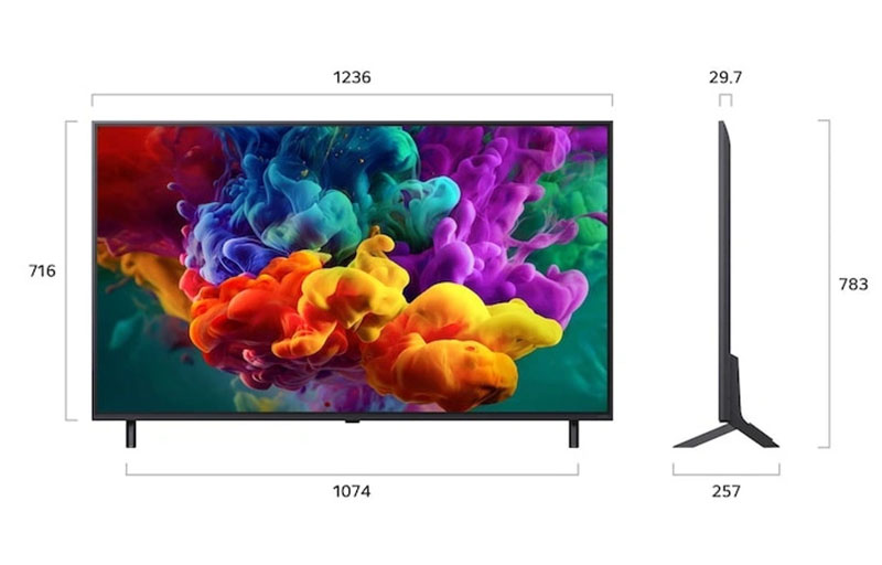 Kích thước có chân, đặt bàn: Ngang 123.6 cm – Cao 78.6/74.6 cm – Dày 26 cm
