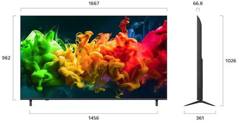 Kích thước không chân, treo tường: Ngang 166.7 cm – Cao 96.2 cm – Dày 6.68 cm