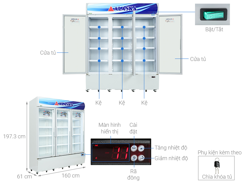 – Khóa cửa tủ: giúp người kinh doanh kiểm soát việc đóng mở cửa tủ, tránh trẻ nhỏ tinh nghịch mở cửa thường xuyên và ngăn kẻ trộm lấy cắp thực phẩm bên trong.